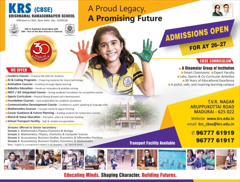 Krishnamal Ramasubbaiyer School aims at the greatest joy of learning, with innovation and ethos based education as foundation. It is a coeducational institution serving the children since (June 2, 1995 Friday) and now conduting from Grade KG to XII. KRS believes where education care and play go hand and hand. We instill our student the value of truth, honesty, transparency and straight forwardness in thought and actions. We equip and give space for our children to express their curiosity and explore, ideas by inviting them to enhance their intellectual, social, physical and emotional growth. We have a dedicated team working with the mission to develop the all round personality of the child. We inculcate in them an education that will help them to understand society and their own responsibilities towards it, nurture the environment in which they live and respect every individuals uniqueness. We are successful in providing holistic education that encourages students to excel in multiple disciplines.