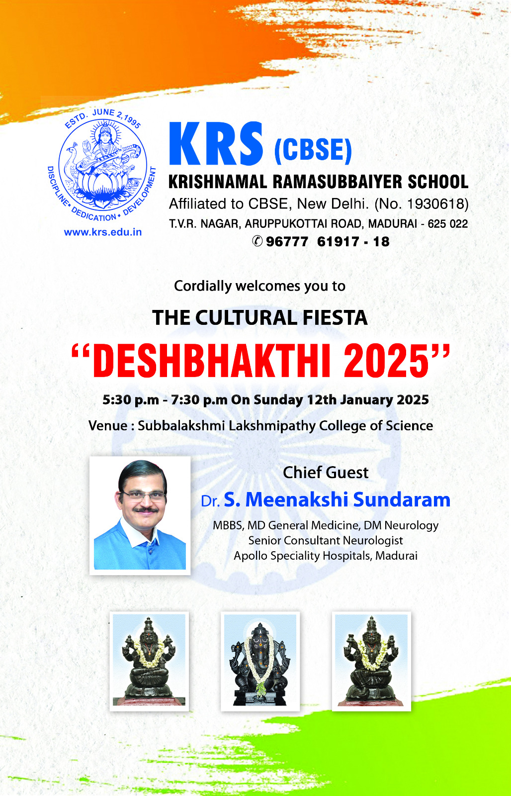 The “Deshbhakthi 2025” cultural event by Krishnamal Ramasubbaiyer School (KRS) will be held on Sunday, 12th January 2025, from 5:30 p.m. to 7:30 p.m. The venue is Subbalakshmi Lakshmipathy College of Science.